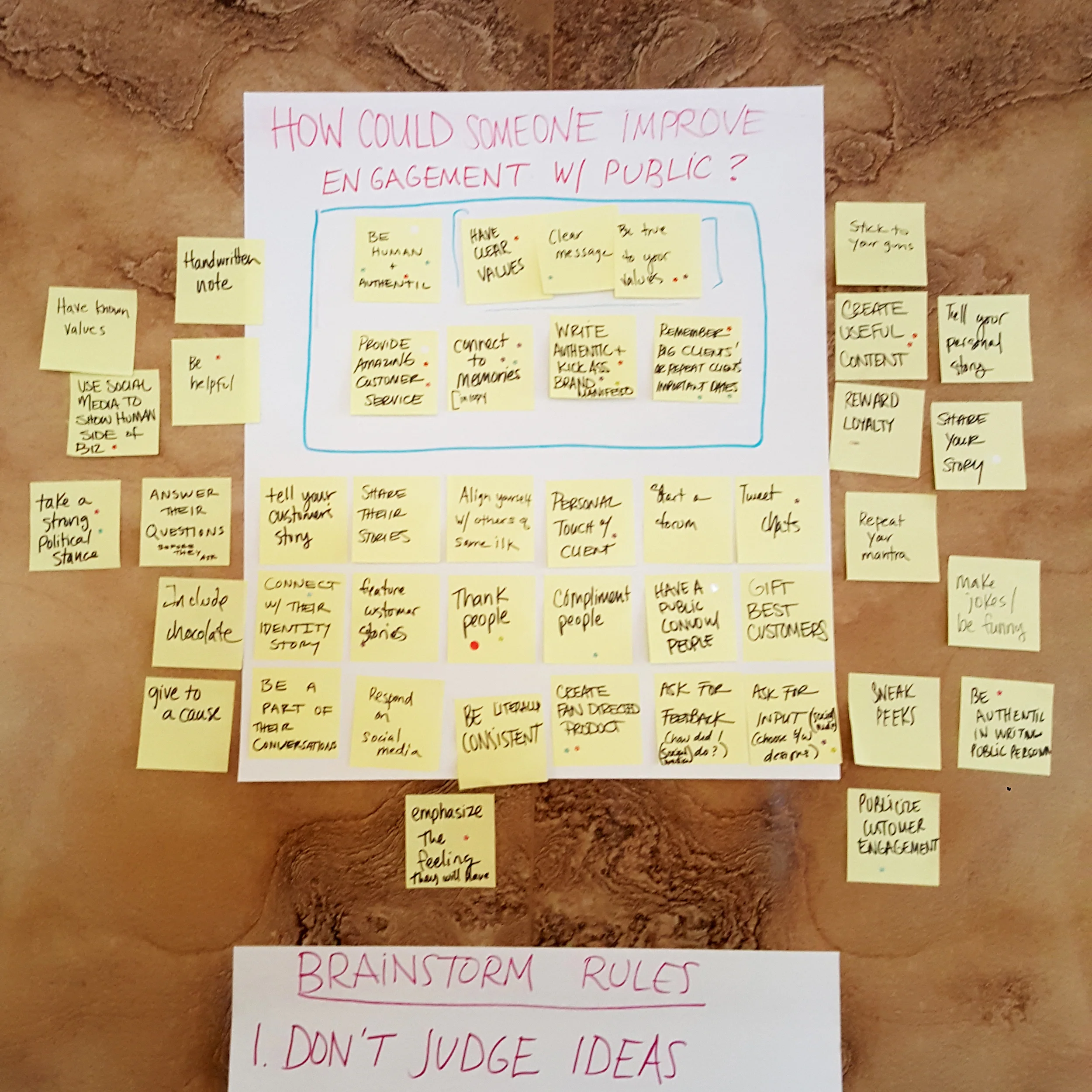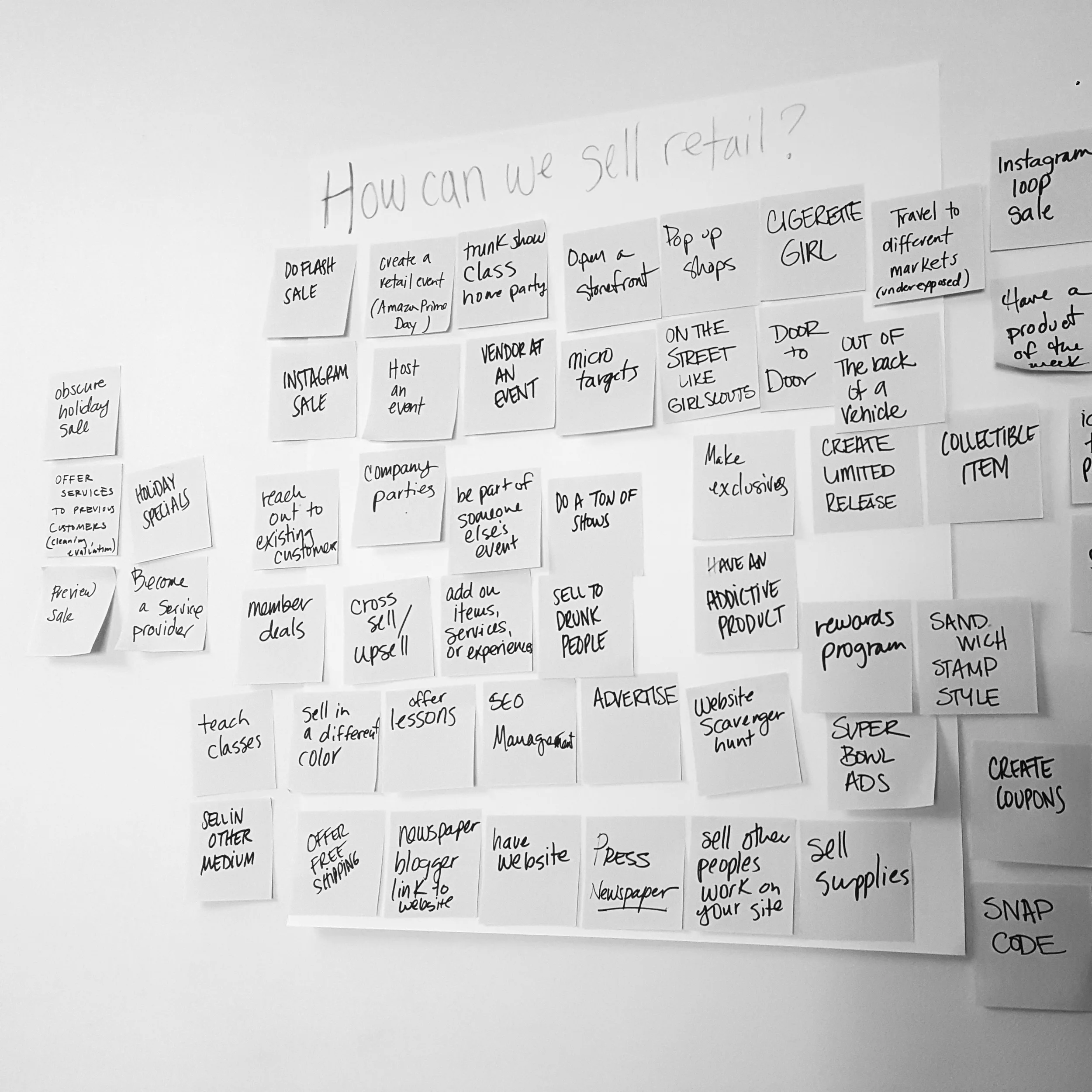 At our mid-year retreat, we chose the latter. Each of us placed stickers on our favorite ideas, and then the ideas with the most stickers got a little more focus. We fleshed out ideas such as "Connect to Memories," "Have Clear Values," and " Create Limited Editions." For each of our favorite ideas, we thought about how they might work. What were examples of other people doing something similar? What would be ways of executing these ideas cheaply? What are some potential hold ups with execution, and how could we get around them? Working through the bigger picture concepts helped us come up with even more specific ideas like ways to remind customers to repurchase consumables, ways to build excitement for upcoming product launches, and how to streamline emails to improve customer service. Although we got more specific here, it is again important not to judge and keep an open mind.